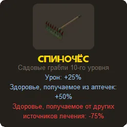Также, поднятые аптечки восстанавливают на 50% больше хп, но лечение из других источников(медик, диспенсер) становится малоэффективным. Хотя медик гораздо медленнее лечит пиромана, экипированного Спиночёсомом, убер-заряд будет накапливаться также, как и обычно. Это позволяет медику гораздо быстрее набирать убер-заряд на тяжело раненном пиромане с граблями.