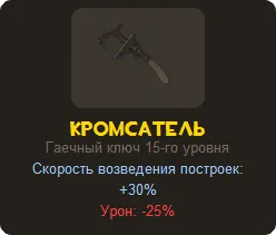 Кромсатель ускоряет на 30% строительство любой постройки инженера лишь тогда, когда он бьёт по ней ключом.