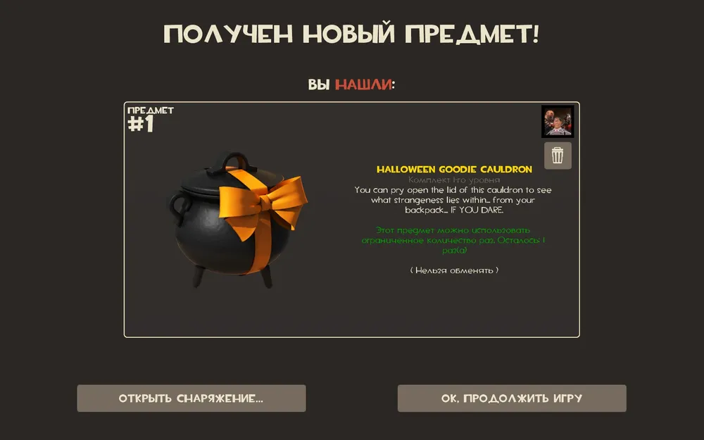 открыв его, у нас появятся такие вот хэллоуинские предметы(Маска всем дается, а второй предмет один он хэллоуинского набора)