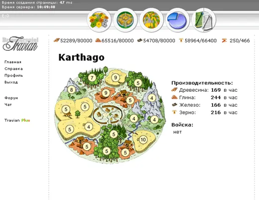 2) Сразу после регистрации нового игрока вы попадаете на страницу своей деревни. Деревня разделена на две области. Во внешней строятся фермы, шахты, лесопилки. Во внутренней - здания экономической и военной инфраструктуры. В зависимости от уровня своего развития предприятие (здание) может производить различные количества тех или иных ресурсов: например, ферма нулевого уровня производит 2 единицы зерна в час, а ферма 10-го уровня — 200 в час.