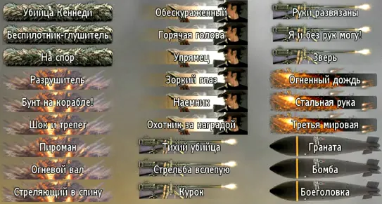 Только я ещё хочу упомянуть о навигации и поиске. Сменить нашивки можно в мультиплеере, перейдя по пунктам "начать"->"удостоверение"-> "прозвища". Где мы увидим аж 22 страницы этого чуда. На каждой страницы три колонки, в каждой из которой по 9 прозвищ. В таблицах ниже предоставлены все из них, которые находятся на первых трёх страницах.
