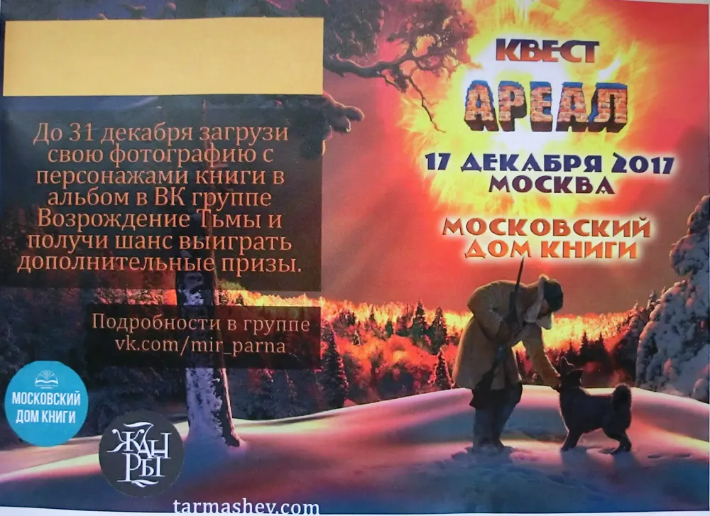 (Во время осенней книжной ярмарки на ВДНХ я был свидетелем викторины по «Тьме» Сергея Сергеевича Тармашева: вопросы задавались чрезвычайно непростые; требовалось подробное здание книг. Неудивительно, что я ожидал того же от квеста!)