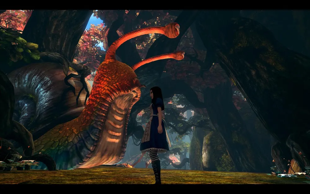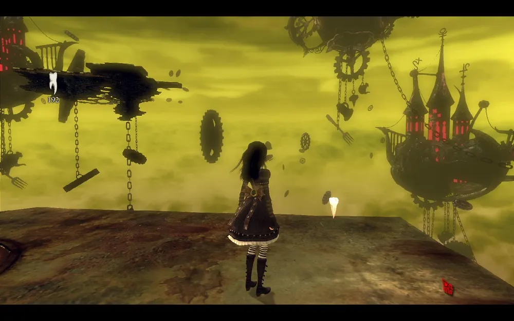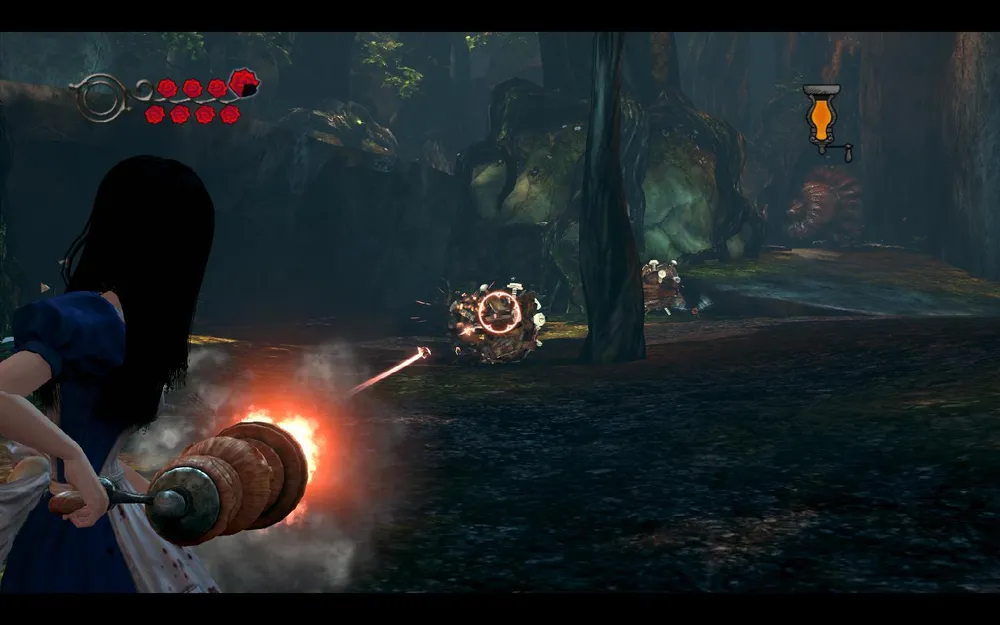...из игры получился слешер. А учитывая игродизайн уровней, то ещё и слешер-платформер. Вообще, в этом нет ничего особо плохого, если не считать того, что игровой процесс получился чертовски однообразным. Да, иногда игроку предлагают логические задачи, есть пара боссов, но стержень игры это не меняет. Для PC-игрока грустным будет и то, что, благодаря мультиплатформенности игры, у Алисы весьма своеобразное управление, активно использующее «захват в прицел» противников. Даже при не особо массовых боях это может приносить определённые неудобства.