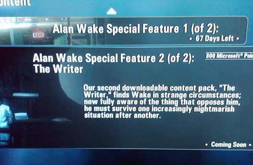 Глядя на меню загрузки контена в Alan Wake, мы заметили, что не только эпизод“The Signal” был с обратным отсчетом, но также в списке было второе DLC с названием “The Writer” ценником в 800MSP. “The Signal” будет доступен через 2 месяца. Возможно произошел сбой и это не было предназначено для показа, но мы успели заснять.