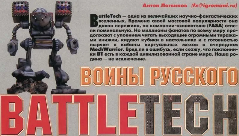 Много взято также из статьи о Проекте "Русский BattleTech" и публикации в журнале Игромания №08 за 2002 год: Автор Антон Логвинов (fx@igromani.ru). Также использована информация с русских сайтов Бэттлтеха. Также очень помогли заметки LostSoul SD и Demolon на форуме http://forum.prowh.ru/forumdisplay.php?f=119 .