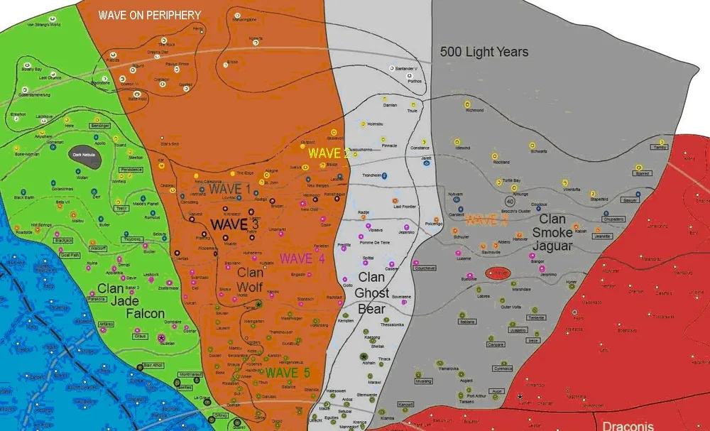 На Периферии захвачены следующие миры: Кланом Нефритового Сокола: Мир Фон Стрэнга, Сумерки, Последний Шанси Готтердаммерунг, астероид Скала(?) и Лакхов.