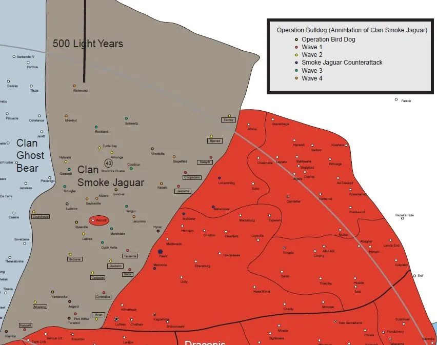 Удивительно быстрый успех операции «Бульдог» превратил 4-ю волну вторжения в операцию зачистки территории. Пока принц Виктор Штайнер-Дэвион вёл несколько подразделений через Периферию в пространство Кланов, чтобы усилить силы нападения на Охотницу, Хан Волков (в Изгнании) Фелан Келл командовал несколькими последними битвами, которые произошли в Синдикате Дракона.