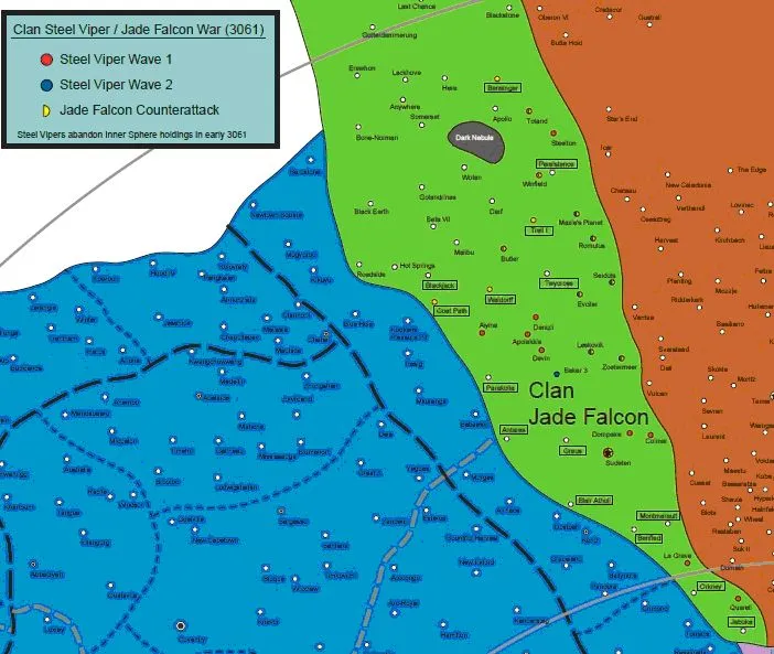 (апрель - июль) Минимальное участие Клана Стальной Гадюки в Войнах за Владения в мирах Клана удивило многих Ханов, пока в апреле 3061 года не обнаружилась причина этого. Гадюки со времён Великого Отказа скрытно перемещали огромное количество материалов и нескольких ударных подразделений в пространство Внутренней Сферы.