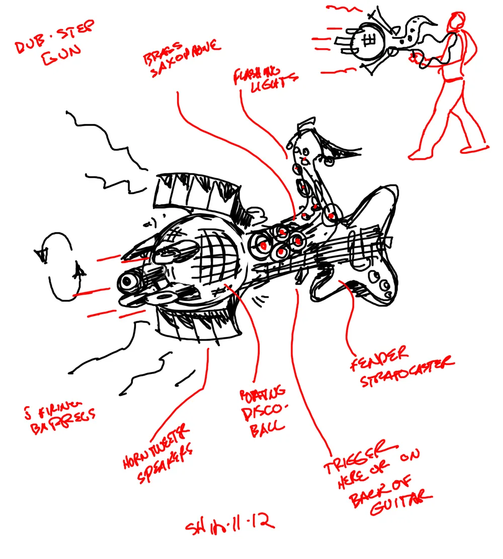 Эта пушка пережила немало изменений. Сначала я нарисовал громоздкий гибрид гитары, диско шара, саксофона и вращающихся колонок. Быть может, игрок мог бы играть на саксе и, таким образом, выпускать ракеты. Должно быть, наш игрок должен был быть кем-то вроде Диззи Гиллеспи с его щечками.