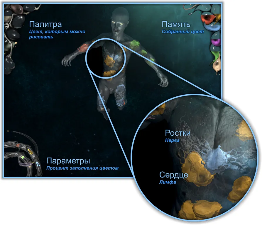Всё что можно хорошо видеть в полупрозрачной фигурке - это Цвет. Он является и валютой, энергией, пищей, домом, источником жизни и источником смерти. Всё одновременно, зависит лишь от того как его применить. Можно потратить Цвет впустую, упустить его в Промежуток, можно пытаться забрать его себе, но чем Цвета больше, тем больше протекает сквозь пальцы, просыпается с течением времени, рассеивается без толку. Можно подарить Цвет и тогда он вернётся ещё в большем количестве чем есть, принесёт кому-то жизнь или смерть. Цвет не может останавливаться, он должен рисовать. Вы можете попробовать нарисовать свой сад, он будет прекрасен, но стоит лишь моргнуть глазом, как Цвет покинет свои места и безнаказанно утечёт восвояси. Цвет можно лишь некоторое время пытаться хранить, чтобы потратить.