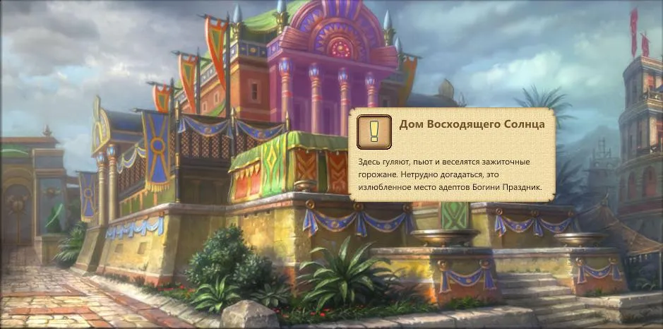 В этом якрокм и прздно украшеном дворце, пьют, гуляют и веселятся Адепты Праздника. От серьезных занятий Адепты Праздника бегут как от огня, зато в деле устройства пиров, торжеств и разных представлений им нет равных. Жители Города устремляются к адептам этого культа и в радости, и в горе. Ни одно торжество без них не обходится, и хозяин скорее выставит меньше блюд на стол, чем откажется пригласить акробатов или музыкантов культа для развлечения гостей. Когда же невзгоды набрасываются на смертного, как стая демонов, он плетется пропивать последние монеты в кабак, принадлежащий адептам, ведь всем известно, что там подают самое хмельное пиво и самое сладкое вино. Степенные горожане презирают адептов за беспутную жизнь, а жены проклинают их, вытаскивая своих благоверных из канав, но жизнь в Городе Богов без этого культа была бы тоскливой и безрадостной. Все шуты и музыканты, развлекающие Владыку, состоят в культе, и недовольные вельможи сетуют, что благодаря этому Культ Богини Праздник – один из влиятельных при дворе.