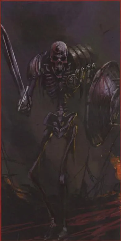Скелеты – они как раз то, чем выглядят. Скелеты смертных, оживлённые и усиленные тёмной магией. Можно было бы предположить, что неупокоенные скелеты менее полезны, чем зомби, которые, в конце концов, куда солиднее выглядят, но это не так. Оживлённые костяки гораздо более ловкие и подвижные, чем ходячие трупы, благодаря тому, что они не полагаются на гниющие мышцы и органы для своей деятельности.