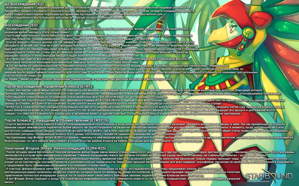 До Восхождения (E0): - Изначально авиане – умеренно-разумная раса охотников-падальщиков. Они находятся на вершине местной пищевой цепочки и не проявляют никакого интереса к технологическому прогрессу. Из-за недостатка солнечного света более четверти площади поверхности Авоса покрыто бесплодной, поросшей кустарниками пустошью, но углеводородной атмосферы достаточно для жизни и медленного роста больших растений, в зарослях которых и обитают авиане.