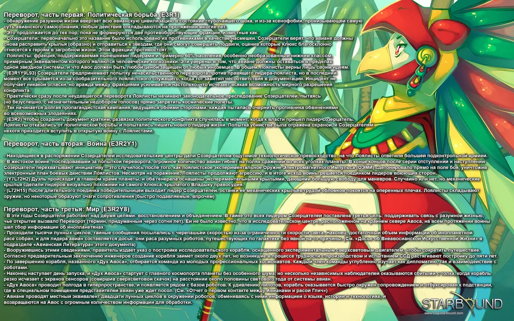 - Проходили тысячи лунных циклов, тайные сообщения посылались с черепашьей скоростью из-за ограниченности скорости света. Наконец, достаточный объем информации об инопланетной расе собран, и для лидера авиан составляется досье: они раса разумных роботов, путешествующих по галактике без явной на то причины.