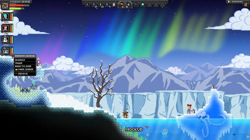 Снова гюнтер, зимний ландшафт, но теперь нам показан интерфейс группы. Еще больше сходства с ММО, я не говорю что это плохо, но так действительно удобней. Выбор функций также привычен для ММО - торговля, сделать лидером и тд. Есть принудительный телепорт на корабль? Если так, то способ троллинга уже готов) Кстати обратите внимание на портреты. Если мистера фриза еще можно понять, но снеговик в группе?.. А пингвин скорее всего пет. И его можно сделать лидером. Хочу себе ракообразного пета, чтобы сделать его лидером группы. Но это скорее всего недоделка игры.