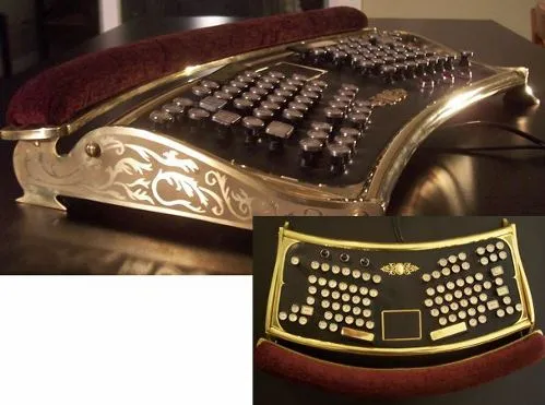 Клавиатура начала свою жизнь как редкая модель эргономической IBM M-15 выпуска середины 1980-х годов. Материалы – латунь, красное дерево и бархат. На боковые гран нанесена гравировка, а LED-индикаторы излучают фиолетовый свет. Работа стала результатом заказа на удобную для запястий клавиатуру с "элегантным, женственным дизайном".