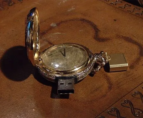Сотрудник американской почты Клод МакДональд (Claude McDonald) утверждает, что он не искал стимпанк: "Он сам меня нашёл". МакДональд посчитал, что настоящий джентльмен должен не только иметь карманные часы, но и пользоваться таким благом цивилизации, как флеш-память. На снимке комбинация старых и новых технологий расположена на кожаном коврике для мыши. 2-Гб носитель заменил музыкальный механизм часов.