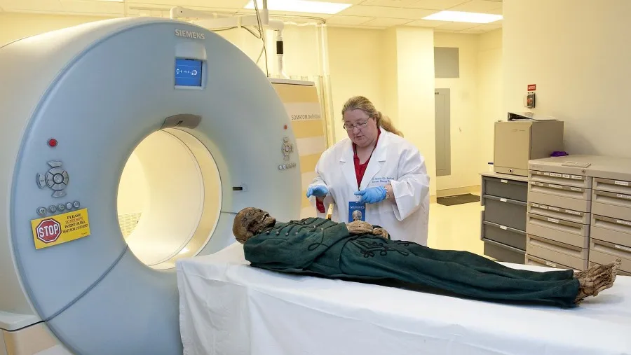 9. 23 июня, 2010. Доктор Хитер Гилл-Фреркинг (Heather Gill-Frerking) , служащая в музее Райс-Энгельхорна, рассказывает: «Компьютерная томография и другие научные методы очень помогают в изучении мумий, с их помощью мы можем узнать больше о том, как люди жили и умирали. Подобная техника является неинвазивной и с ее помощью сделать трехмерную запись мумии для архива, что также позволяет нам сохранить мумии для изучения последующими поколениями». Фотография сделана в Медицинском центре «Седар-Синай», Калифорния.