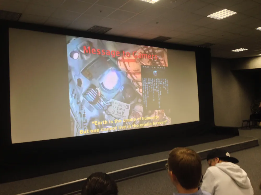 Но и в космосе я не забывал об играх. Вот посмотрите: это фото сделано через 2 минуты после старта Союза ТМ-13. И я держу в руках сообщение, адресованное геймерам всего мира. Оно написано на языке, который я придумал для моей последней на тот момент игры Tabula Rasa.