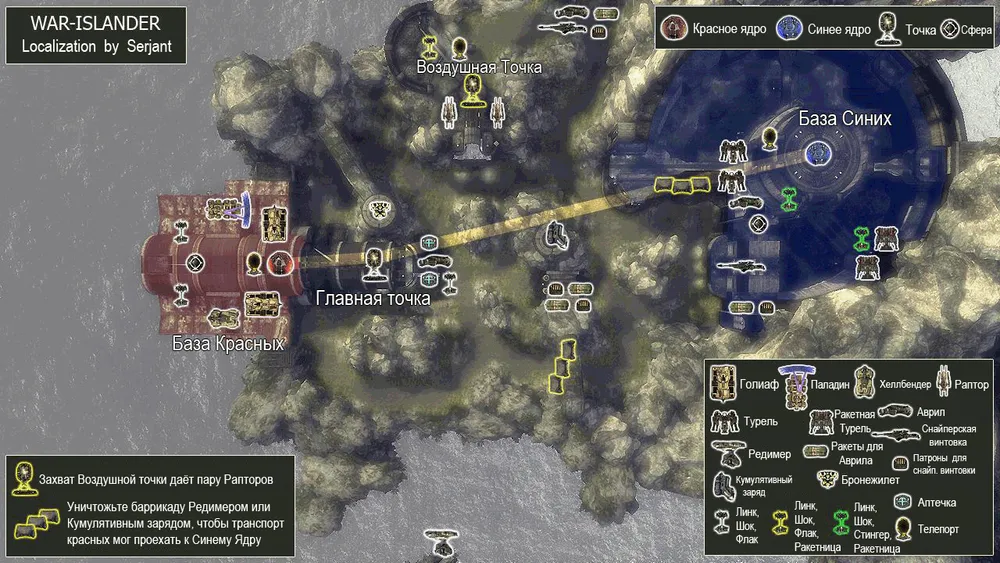 На карте всего одна Главная точка, поэтому ключевую роль на Islander’е как в атаке, так и в обороне играет опытный сфероносец. Именно от его удачных или не удачных действий в большинстве случаев зависит исход матча. И не смотря на то, что точка всего одна, захватить ее можно самыми разнообразными способами! Рассмотрим несколько путей прохода сфероносца от своей базы до заветной Главной точки.