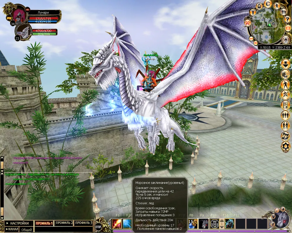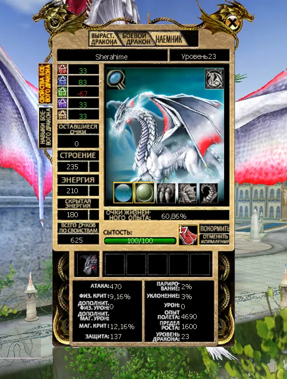 Все ваше внимание в игре должно сосредоточиться на драконе, причем, там тоже не все так просто, ибо детеныши драконов еще не драконы в полном смысле слова, а молодые драконы еще не боевые, хотя способны атаковать с воздуха и носить вашего персонажа на спине. Нет, настоящие характеристики своего дракона вы увидите только по достижении оным 20-го уровня. А так развитие дракона просто как никогда: дракон ест - дракон получает очки для распределения по 3-м характеристикам (строение, энергия, скрытая энергия). Внесли примерно 10-12 очков в одну характеристику - дракон получил уровень. В какую характеристику вкладываться решать вам, но стоит помнить, что каждый цвет дракона определяет и его характеристики. Белый дракон, например, чистый дистанционник, ему и 4500 очков здоровья достаточно, зато очки драконей эссенции стоит увеличивать, потому что чем старше дракон, тем мощнее его заклинания, чем мощнее заклинания, тем больше эссенции они поглощают. Для сравнения ниже приведены экраны дракона и человека.