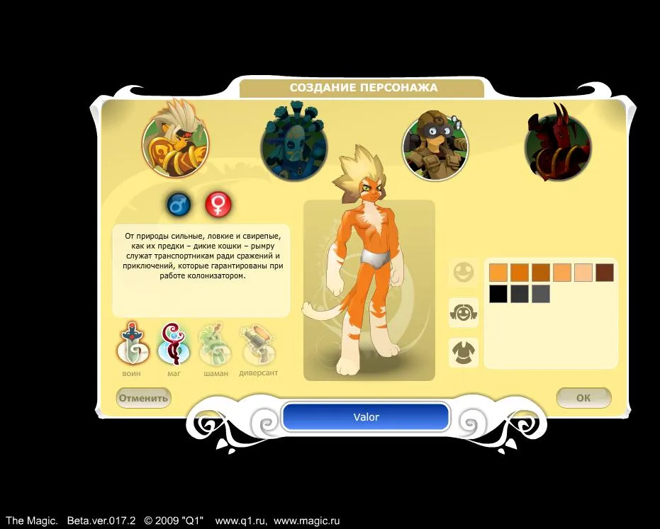 Из рас для выбора доступны некие Рымру(люди-кошки) и собственно люди. А дальше моя голова пошла кругом. Почему-то более блеклая иконка пола - показывает выбранный пол, а более яркая возможный вариант. С каких пор так? В начале наступает конфуз. Та же история и с выбором класса. Странно. Ну да ладно, для первого захода я выбрал мага и назвал его Valor. В путь!