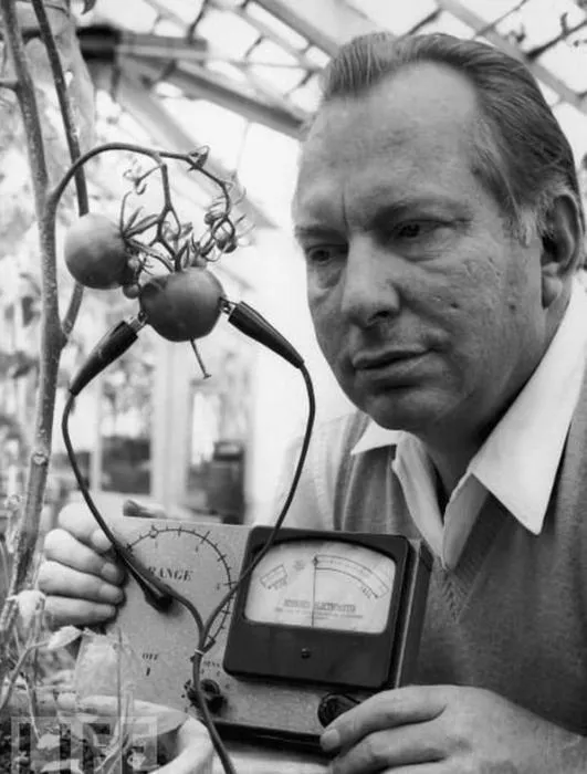 А вот в 1968 году, как вы видите на фотографиях, он пытался услышать чувствуют ли помидоры боль.