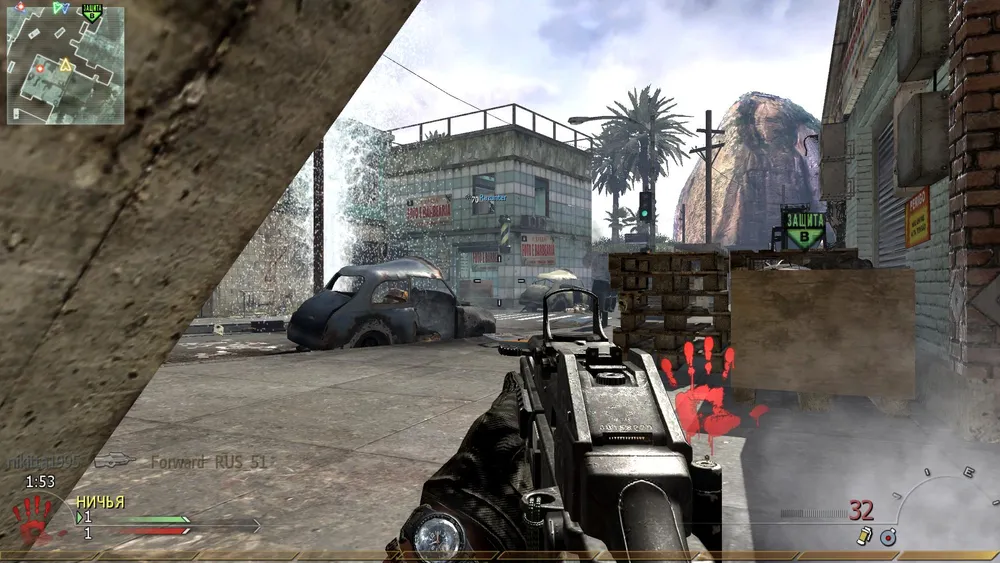Ладно, двигаемся дальше. Допустим, нашему бегуну удалось заминировать точку, а остальная команда сейчас находится совсем на другой позиции — она бьется там. Теперь возможно два варианта. Либо пять человек таки продавят неприятеля и поставят вторую бомбу (этому может способствовать то, что часть врагов убежит разминировать другую точку), либо атака захлебнется и надо будет бежать к уже зеленькой позиции, защищать свое взрывное устройство.