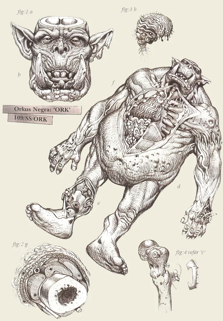 Имперские отчеты содержат множество упоминаний о войнах с орками, но в них практически ничего не говорится об их происхождении. Единственно известно, что орки - остатки расы зеленокожих созданий, чьи поселения распространялись по все вселенной. Древняя раса орков подразделялась на три основные физические касты: каста рабов-гретчинов, каста воинов-орков и правящая каста, известная как Мозговые парни. Последние процветали еще до развития человечества, развивая технологии и управляя другими кастами. Орки и гретчины - возможно специализированные мутанты, созданные Мозговыми парнями для выполнения определенных функций, но ничего нельзя утверждать с уверенностью.