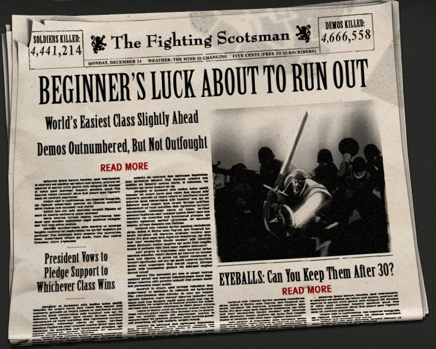 Меч "Одноглазый горец" как нельзя лучше подходит стратегии, которой веками придерживались шотландские циклопы, лишенные трехмерного зрения: баловство с ружьями, стрелами, камнями и прочей дальнобойной ерундой не помогает убивать. Чтобы кого-нибудь убить нужно взять самый большой меч, который только удастся найти, подбежать к засранцу в упор и отрубить к чертовой матери его тупую башку.