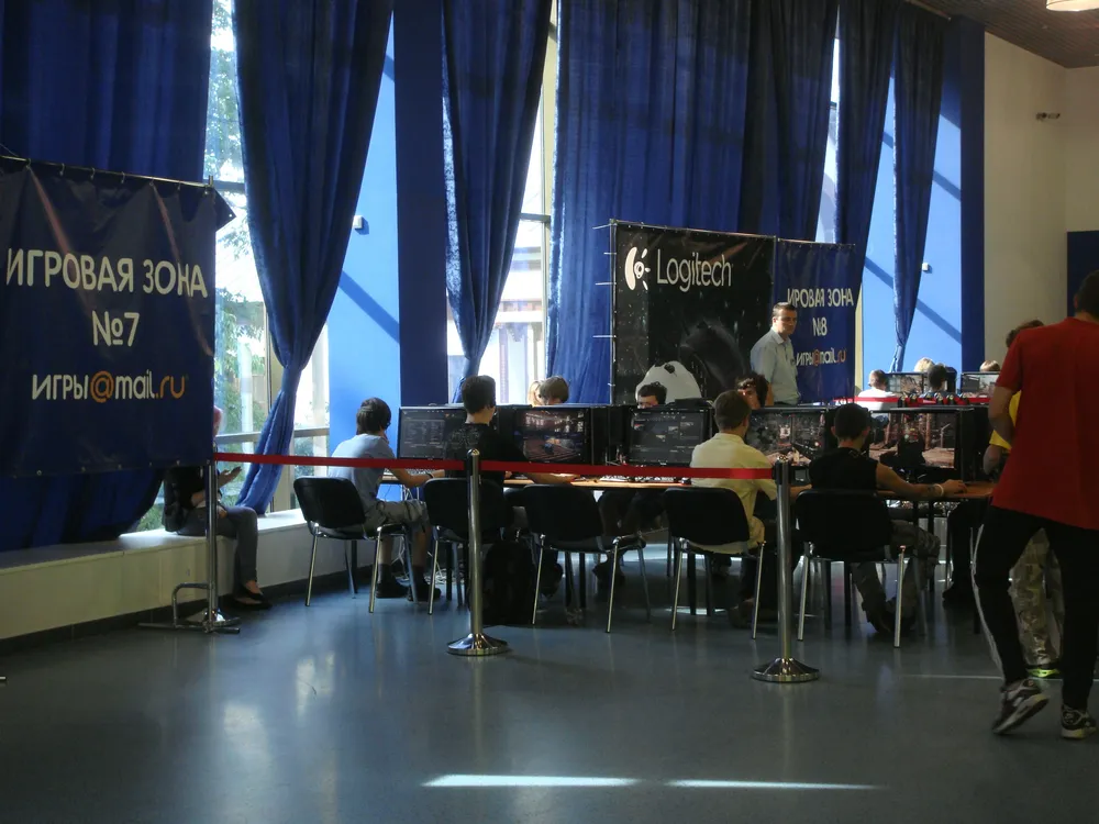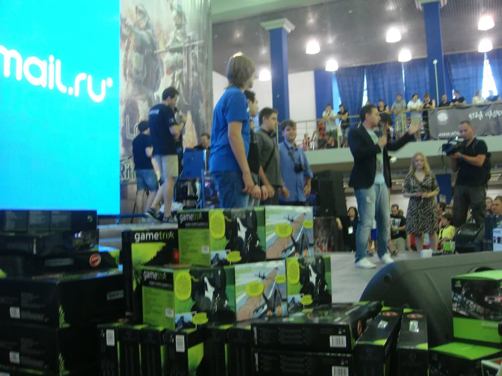 В дальнем конце происходило главное действо. Там располагалась сцена с двумя ведущими, огромный экран, куча призов от различных компаний-спонсоров, которые должны были разыгрыватся среди посетителей, и десяток компьютеров - пять с одной стороны и пять с другой. Именно там далее и предстояло играть киберспортсменам.