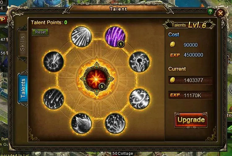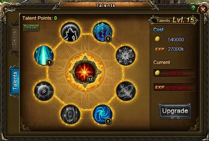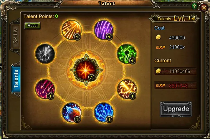 Когда вы откроете меню талантов,то вам будет доступно 1 очко умений, которое вы должны будете вложить в Holy Seal. Чтобы получить больше очков для изучения, вы должны прокачивать уровень талантов (1 уровень - 1 очко для изучения), за золото и опыт. Опыт тратится только с текущего уровня персонажа, т.е. опыт с предыдущего уровня не может быть использован для прокачки.
