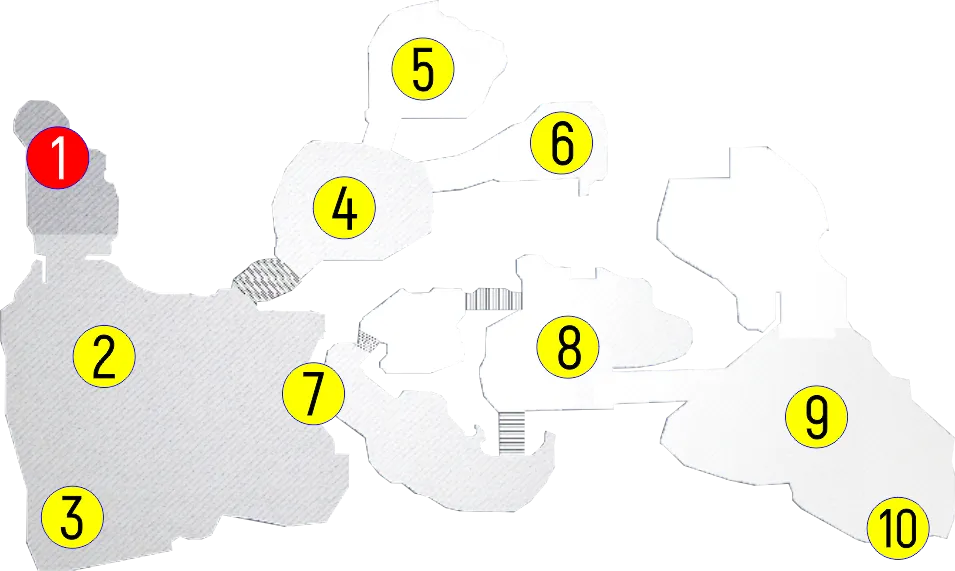 1 – выход на поверхность. 2 – бар “Фабричная лавка”. 3 – минное поле. 4 – вход в шахту. 5 – жилое помещение. 6 – балкон. 7 – помещение охраны. 8 – лаборатория. 9 – командный пункт. 10 – шлюз.