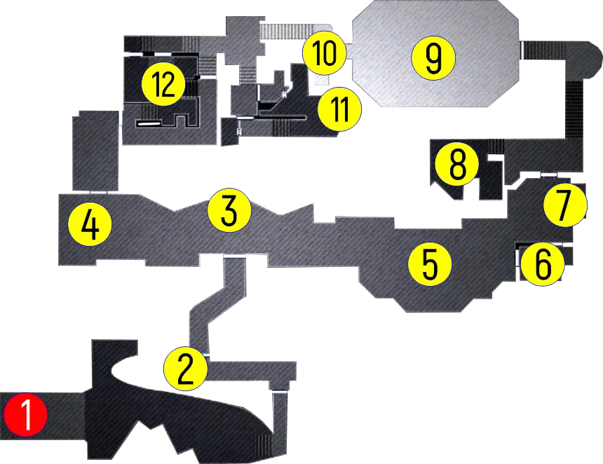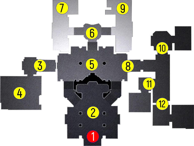 1 – переход в Бродмур-Хайтс. 2 – вестибюль. 3 – галерея трофеев. 4 – столовая. 5 – приемный покой. 6 – трон. 7 – комната отдыха. 8 – частное крыло. 9 – казарма. 10 – покои Виктори. 11 – покои Вэлоа. 12 – покои Либерти.