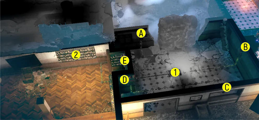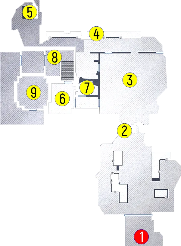 1 – переход в Бродмур-Хайтс. 2 – оранжерея. 3 – комната отдыха. 4 – галерея. 5 – лазарет. 6 – ВИП-палата. 7 – электрощитовая. 8 – хранилище. 9 – тюрьма.