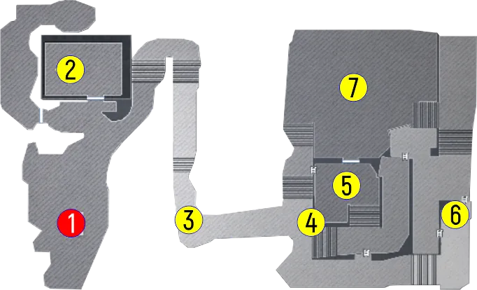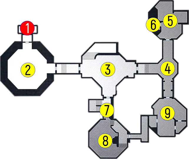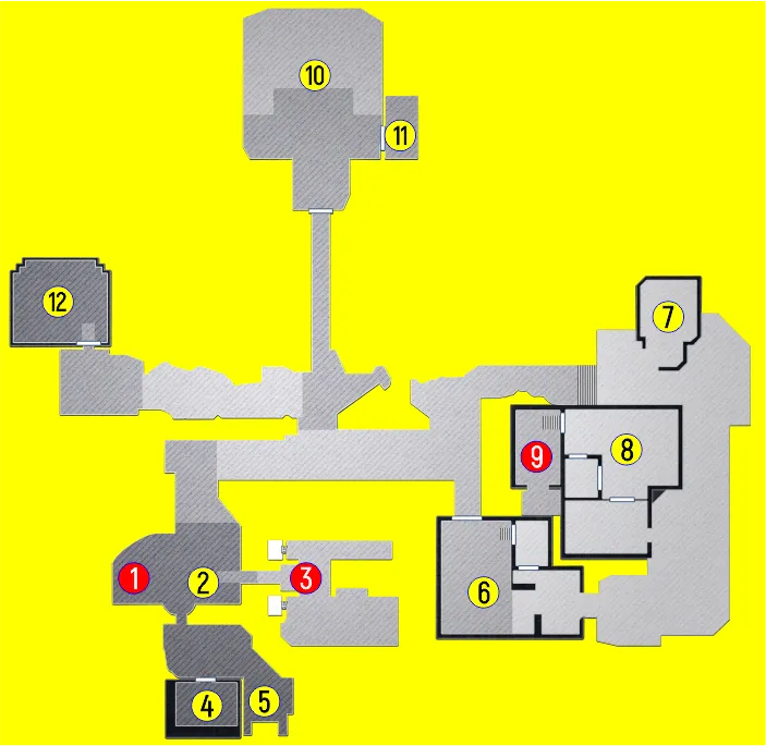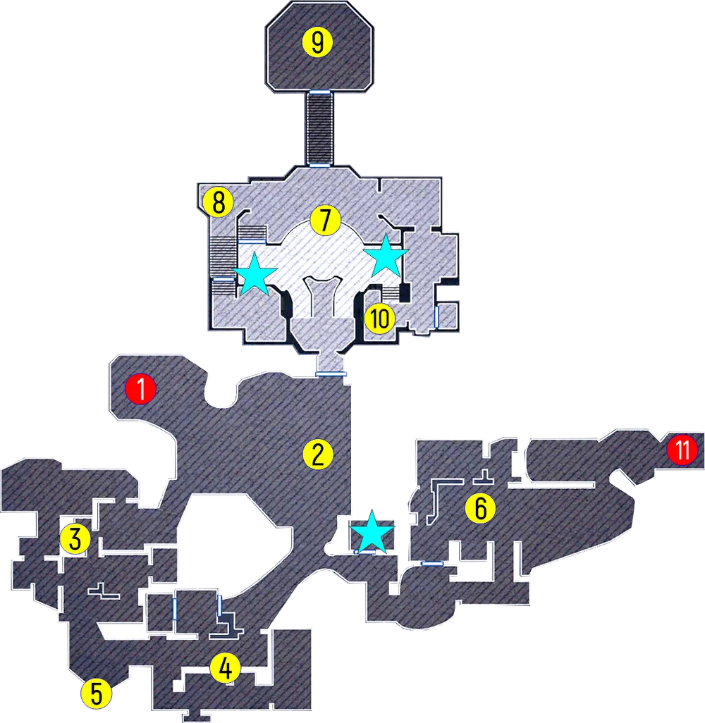 1 – переход на карту мира. 2 – зарешеченная дверь. 3 – вестибюль. 4 – железнодорожный состав. 5 – радиомаяк. 6 – бар. 7 – склад. 8 – вход в бункер. 9 – Моргенштерн.