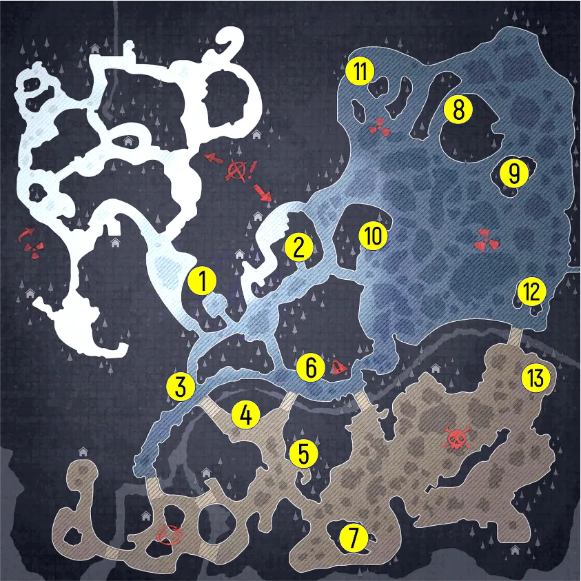 1 – переход на глобальную карту. 2 – торговец Ананда Рабиндранат. 3 – вход в Диковинариум. 4 – лагерь надеющихся. 5 – торговец Шестипалый Ларри. 6 – склад игрушек. 7 – теплица. 8 – кабинет стоматолога. 9 – переход в туннели. 10 – лагерь контрабандистов. 11 – склад контрабандистов. 12 – старый магазин.