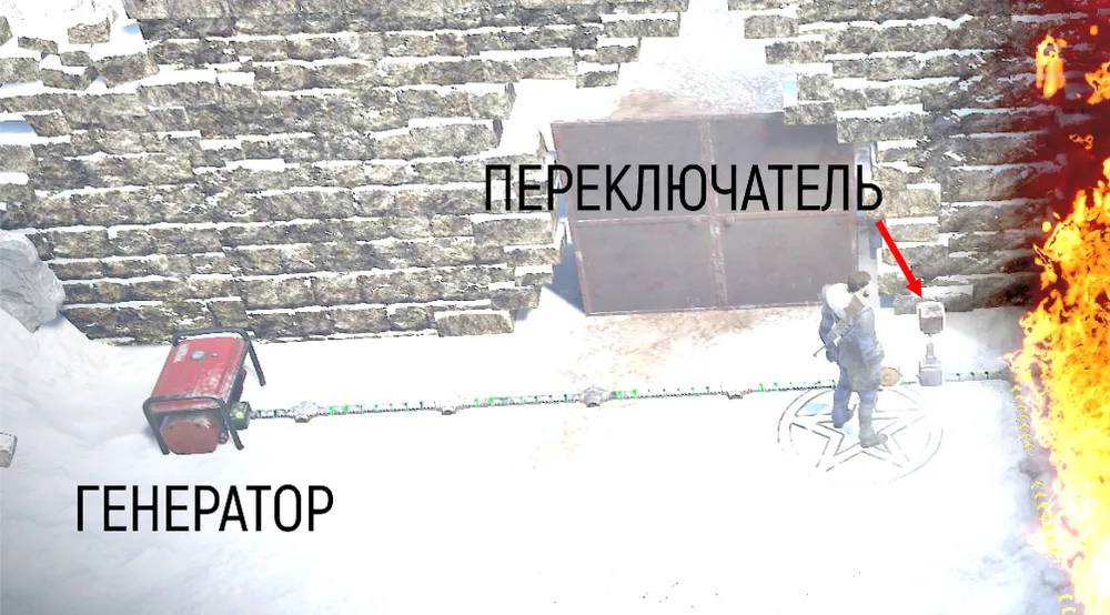 Чтобы отключить у входа на нефтепромыслы огненную завесу, почините генератор (навык Работа с механикой 4), а после используйте переключатель. Это уберет огонь и позволит вам зайти на нефтепромыслы через тоннель.
