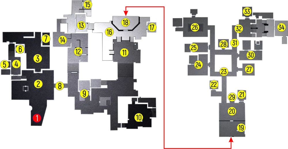 1 – переход на карту мира. 2 – двор. 3 – гостеприимный дом. 4 – домик прислуги. 5 – торговец Снежок. 6 – аппаратное помещение. 7 – человекоориентированный магазин управления. 8 – подъемный мост. 9 – стройка. 10 – бункер. 11 – Федерико. 12 – Перчатка. 13 – загон для животных. 14 – вращающиеся лезвия. 15 – могила Клио. 16 – северная площадка. 17 – туалет. 18 – подъемник. 19 – Харди Нокс. 20 – вестибюль. 21 – комната радистов. 22 – диспетчерская охраны. 23 – камин. 24 – лаборатория. 25 – холодильный склад. 26 – сауна. 27 – подвал. 28 – сокровищница. 29 – секретное помещение. 30 – гостевые апартаменты. 31 – газовый заслон. 32 – вход в крыло Патриарха. 33 – Гвендолин Рид. 34 – Вик Бьюкенен.