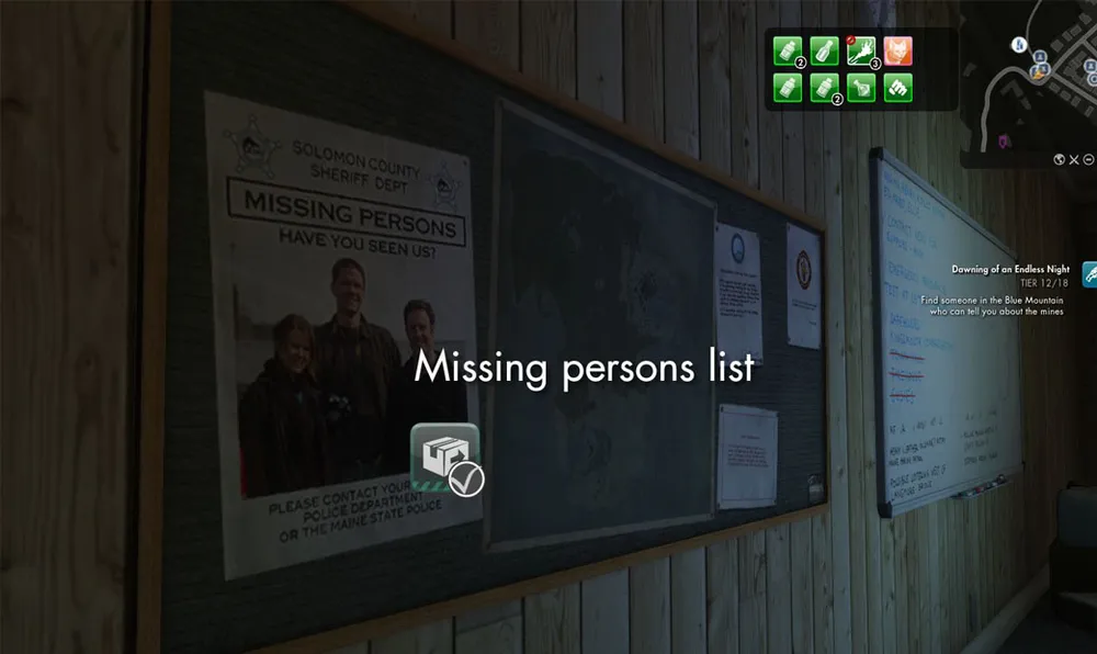Большая часть заданий выполняется в несколько этапов (Tier), причем это может быть как сложносоставной этап "Перебить 20 зомби, собрать их останки и сжечь в костре", а может быть просто перемещением из пункта А в пункт В.