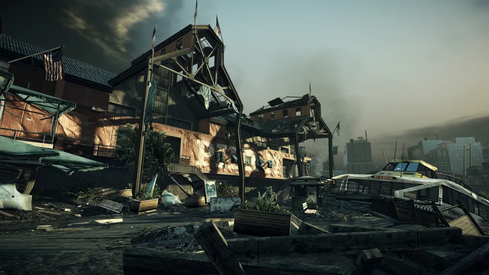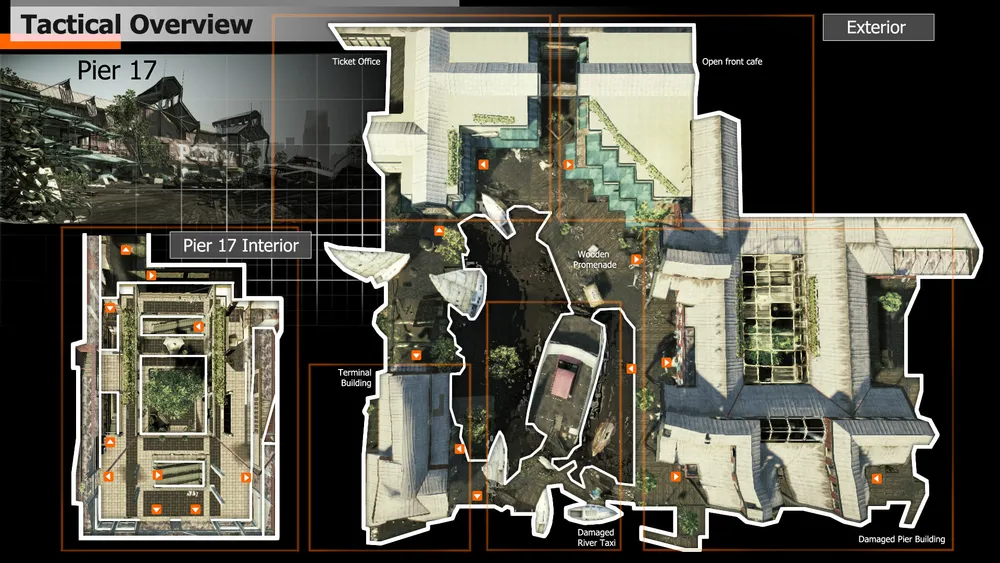 Разрушенная аллея пирса с видом на разрушенную гавань, с располагающимся напротив портом, который на грани погружения в океан. Эта карта в форме U имеет несколько больших открытых пространств с ограниченной верхушкой, так что используйте режим скрытности, чтобы передвигаться невидимым и удивить своих врагов.