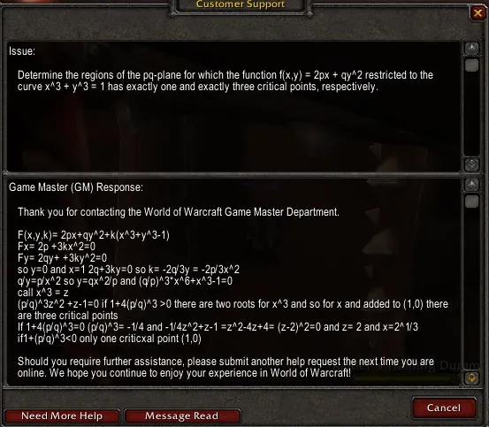 На скриншоте GM помог решить задачу по математике игроку, настолько сильно занятому игрой в Warcraft, что у него совсем не осталось времени на домашнее задание.
