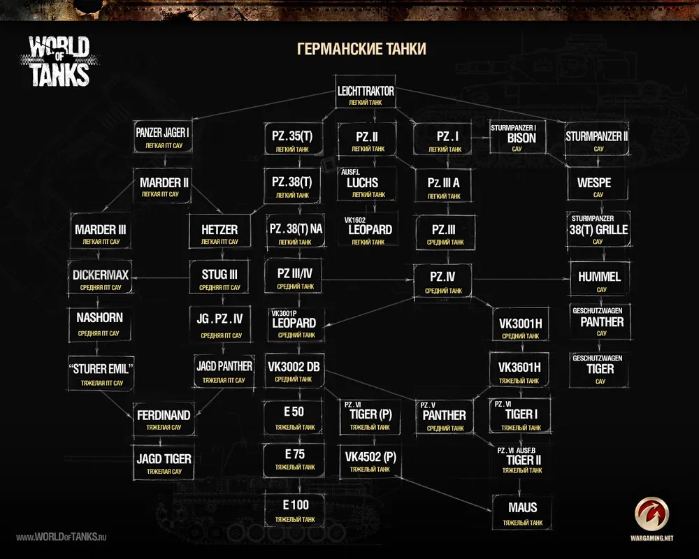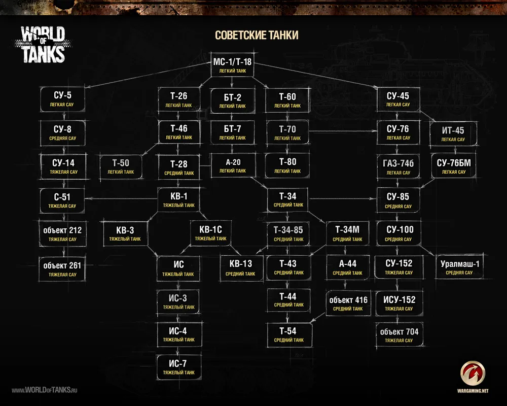 Легкие танки быстры и маневренны, но очень уязвимы, огневая мощь оставляет желать лучшего. Главная функция таких машин - разведка, предоставляющая вести огонь тяжелым дальнобойным САУ. Средний танк быстрее тяжелого, крепче легкого и бьет неплохо. Там поддержал контратаку, там пришел на помощь легкому танку, а там провел разведку. При должной сноровке управляющего доставляет немало хлопот недругам. Ну а тяжелый танк славится мощнейшей огневой мощью, крепкой броней и небольшой скоростью передвижения. При поддержке легких и средних танков крайне грозная сила. САУ (самоходные артеллерийский установки) гонять по полю не получится - неприятель в миг превратит эту грозную машину в груду металлолома. Но зато у САУ превосходная огневая мощь - большой урон и хорошая дальнобойность. Противотанковые САУ же непрочь подвигаться по полю боя, притом и управляются вроде как неплохо, и бьют сильно. Главные недуги - крайне низкий показатель брони и неподвижная башня.