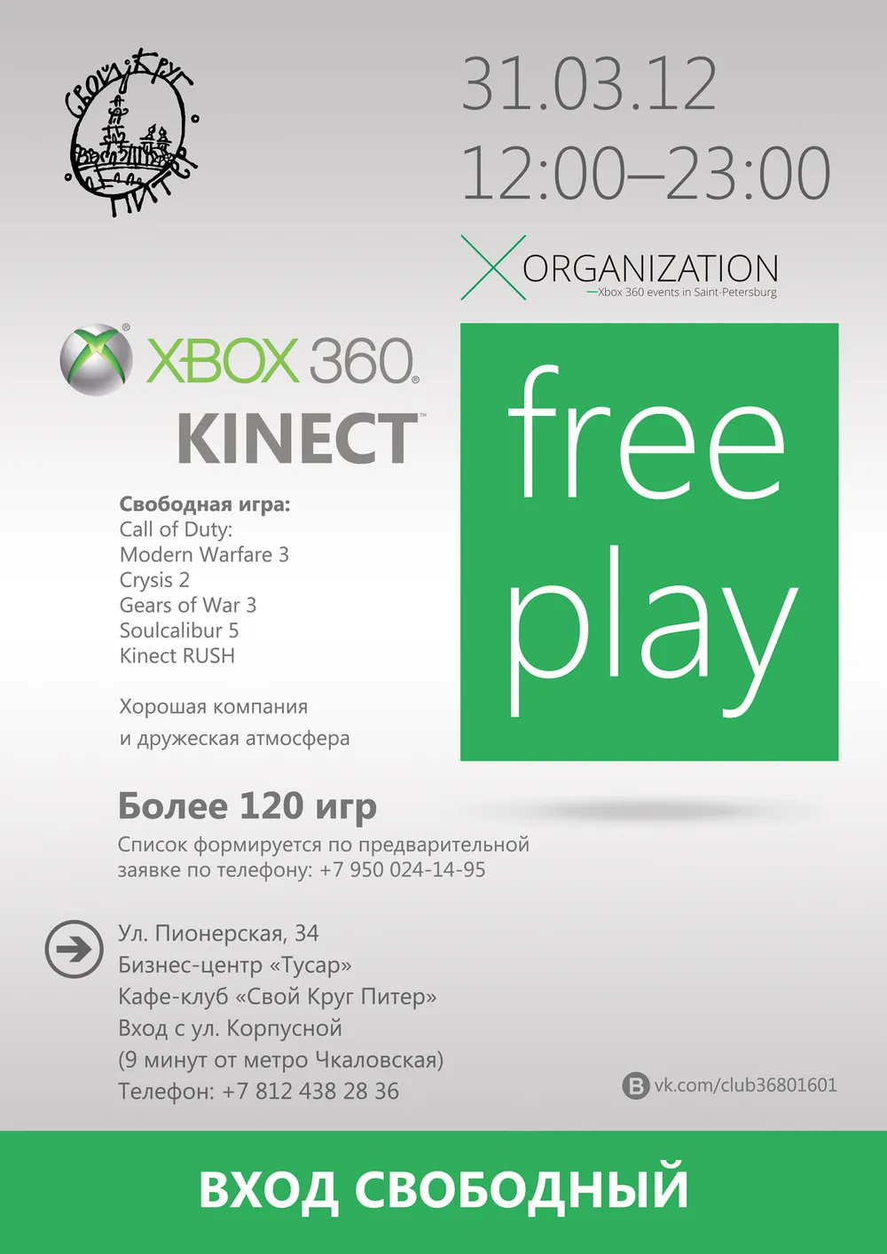 Xbox 360 Free Play 31 марта в 12:00 в клубе "Свой Круг" Санкт-Петербург