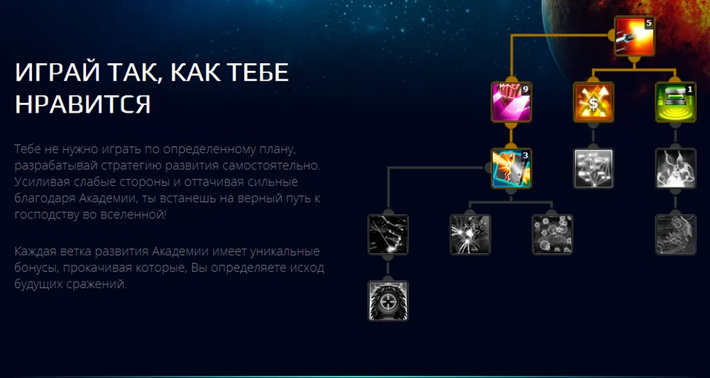 Начать свой путь придётся с небольшой планеты, которой суждено стать столицей целой империи. Стратегия развития предполагает открытие новых технологий, возведение различных построек, кораблей и подготовка обороны. Данный проект предусматривает несколько линий развития. В первом случае Вы можете стать шахтёром и пересылать ресурсы своим друзьям. Во втором варианте полагается стать профессиональным бойцом, задача которого добывать ресурсы при помощи собственного флота. И, наконец, третий способ предлагает быть наемным шпионом, в распоряжении которого разведывательные зонды и навыки в любой специализации.