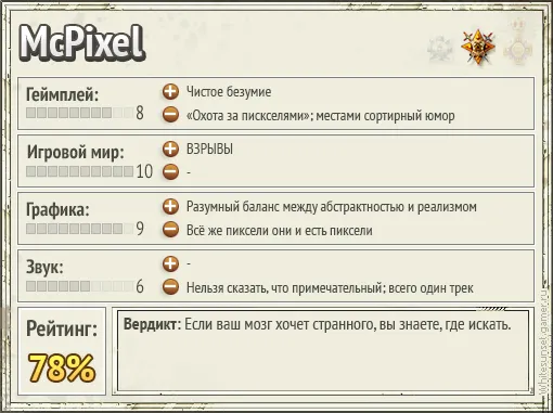 McPixel — это весьма своеобразное творение, впрочем, завораживающее своим выхождением за все рамки разумного. К этой игре нельзя относиться серьёзно и нельзя её как-то особо анализировать: это опасно и попросту бессмысленно. Но на неё стоит хотя бы взглянуть, чтобы в очередной раз убедиться, насколько широко способно варьироваться то, что люди называют «здравым смыслом».