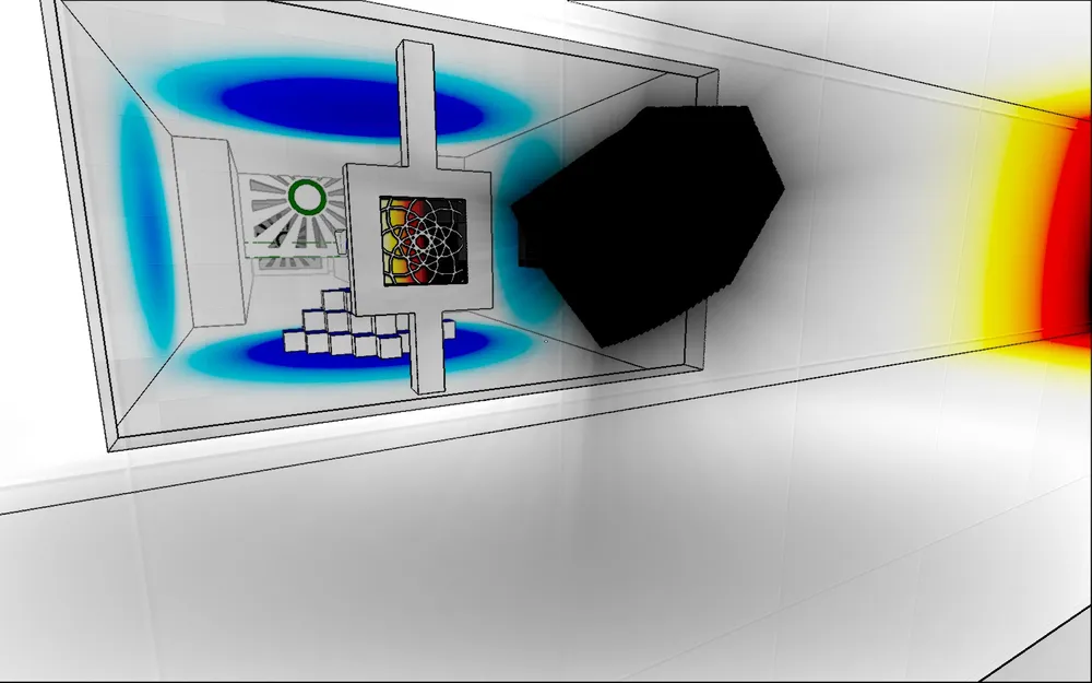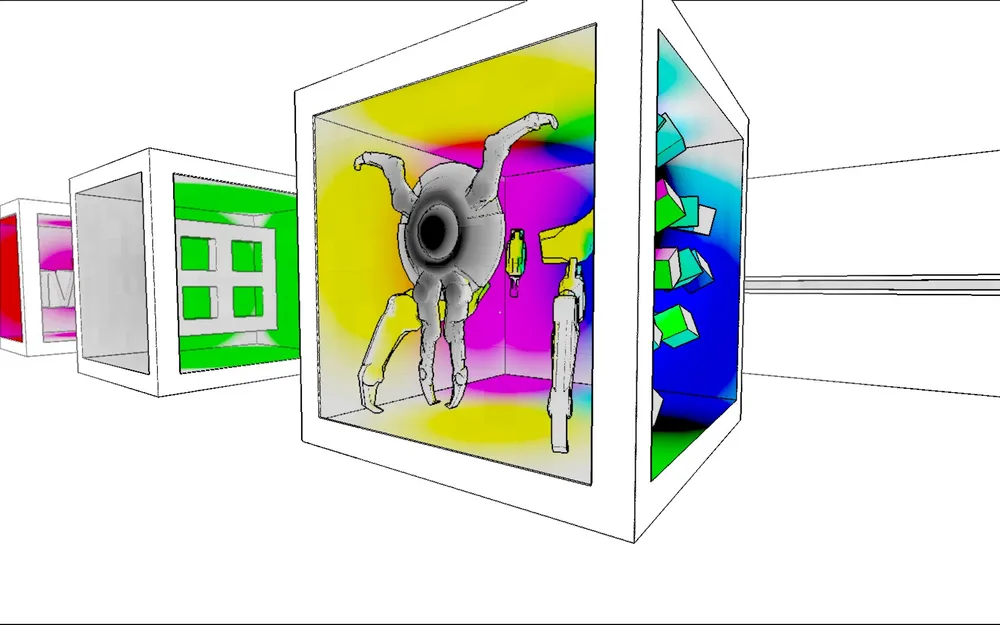 Игрок какое-то время может следовать вдоль белых стен или почти едва различимой черноты прохода, и вдруг его окутывают яркие кислотные цвета. В попадающихся комнатах встречаются геометрические фигуры, кинематические композиции из них и разнообразных образов из жизни.