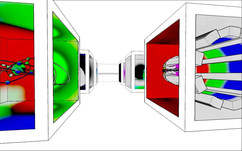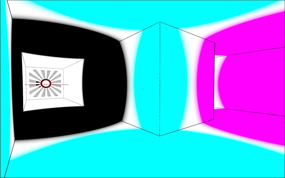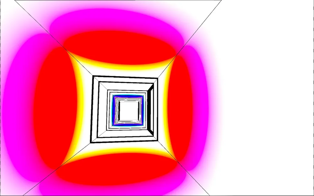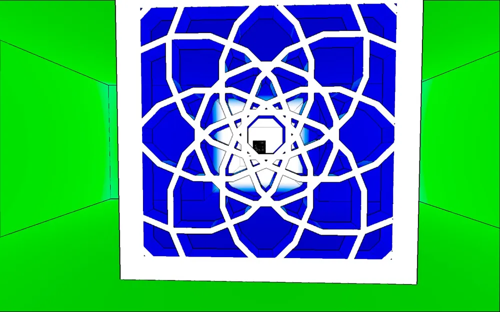 Пространство коридоров и комнат, которые исследует игрок, топологически не замкнуто, то есть, если ты вернешься обратно по своим следам, не всегда попадешь на то же место. Странность топологии коридоров сводит тебя с ума; они плавно переходят друг в друга, незаметно меняя направление, порой замыкаясь (закольцовываясь) на самих себя. Даже не топографический кретин в этой игре может заплутать, но благо всегда есть возможность вернуться в центральную комнату, чья, (о, благословенная, ты), чернота приносит отдых от яркости белизны стен или кислотной радуги переходов.