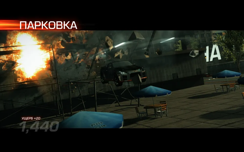 Начинается Ridge Racer Unbounded с мучительного привыкания к управлению: первые полчаса игры я тупо учился проходить повороты. Даже когда за плечами опыт десятков гоночных игр, это трудная задача, поскольку обучения нет, а без него физику RRU понять почти невозможно. Некоторые западные обзорщики даже назвали игру запредельно сложной оттого, что не смогли в этом разобраться! Но секрет прост: дрифт. Деструктивный дрифт. На первый взгляд поведение машины похоже на NFS HP или Ridge Racer 7, где без грамотного скольжения золото не заработаешь. Но если там важно аккуратное скольжение, не касаясь краев трассы, то здесь ситуация обратная: машиной надо отталкиваться прямо от стен. И чем на большей скорости, тем лучше. За дрифт отвечает отдельная кнопка, поэтому скорость не теряется вообще. А если на углу улицы стоит кафе – что ж, скользить предстоит прямо сквозь каменные бордюры. Так и быстрее, и драгоценных очков нитроускорения наберется куда больше.