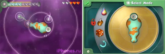 Итак, маленькая спора попадает на Землю. Управляя акселерометром, вам надо накормить ее окружающими бактериями, чтобы усложнить простейшую цепочку ДНК. После каждого уровня вы попадает в Spore Lab, где малютку можно изменить, растягивая тело пальцами, прикрутить новые органы и поставить на более высокую ступень эволюции.
